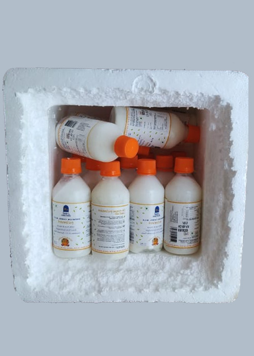We dispatch frozen camel milk with ice in thermocol boxes, either by train or by bus, to a place near you from where you have to pick it up. Before ordering, please call us to discuss how best to send you your order. The minimum order for camel milk is 5 liters.